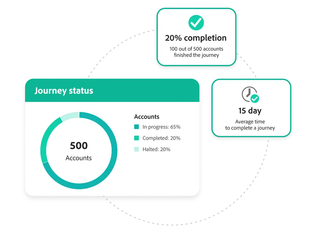 • 고객 여정 상태. 고객 여정에서 중단, 완료, 진행 중 등 계정 상태를 간략하게 볼 수 있는 개요를 통해 계정마다 여정 진행 속도가 다른 이유를 파악할 수 있습니다.