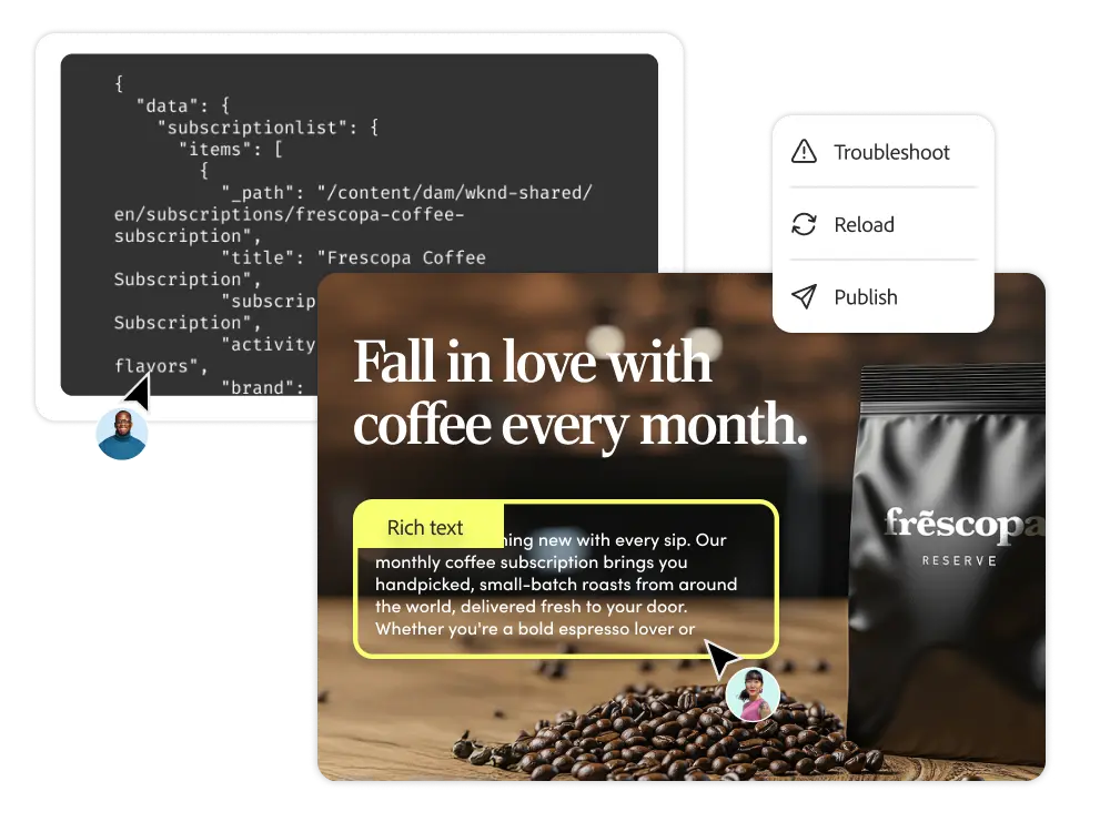코드, 콘텐츠, 디자인 작업을 분리하세요. 콘텐츠 저작, 디자인, 개발을 동시에 수행할 수 있으므로 작업 프로세스를 모듈 방식으로 빠르게 진행할 수 있습니다. 또한 웹 애플리케이션도 더욱 손쉽게 개발, 디버깅, 업데이트할 수 있어 간편한 유지 관리로 개발 속도와 효율성을 높일 수 있습니다.