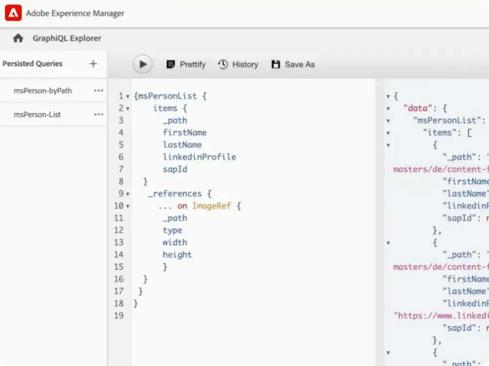 GraphQL API와 같은 강력한 맞춤 API를 통해 Adobe Experience Manager Sites를 확장하고 애플리케이션을 개발할 수 있습니다. GraphQL은 요청된 콘텐츠만 반환하는 효율적인 콘텐츠 검색을 위한 업계 표준 쿼리 언어를 제공하므로 애플리케이션의 유형과 요구 사항에 맞게 응답합니다. 또한 중첩 쿼리를 지원하므로 모든 디지털 채널에서 브랜드에 최적화된 반응형 경험을 신속히 제공할 수 있습니다.
