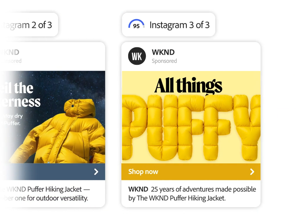 • 멀티채널 형식. 유료 소셜 미디어, 디스플레이, 웹, 이메일 전반에서 즉시 사용 가능한 템플릿 또는 맞춤형 템플릿을 사용하여 채널별 규칙에 따라 콘텐츠를 생성합니다.
