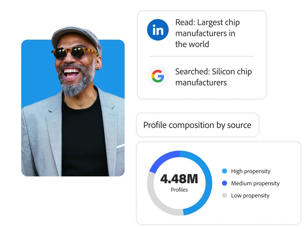 오디언스 활성화는 풍부하고 통합된 고객 프로파일을 이메일, 유료 미디어, 인앱 메시지, 콜센터 등 여러 채널에서 사용할 수 있는 실행 가능한 오디언스로 전환하는 프로세스를 말합니다. 이 기능은 Adobe Real-Time CDP의 실시간 프로파일 저장소와 긴밀하게 통합되어 있으므로, 행동 및 컨텍스트 데이터가 변경되는 즉시 조치를 취할 수 있습니다. 이를 통해 각 관계자들은 다음을 수행할 수 있습니다.
